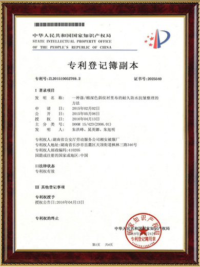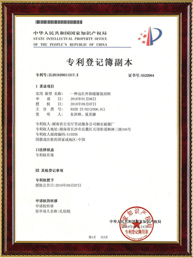 《一種遠(yuǎn)紅外保暖服裝面料》實(shí)用新型專利證書